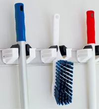 Ce support mural de 90 cm permet de suspendre jusqu’à six balais ou outils de nettoyage, libérant de l’espace au sol.